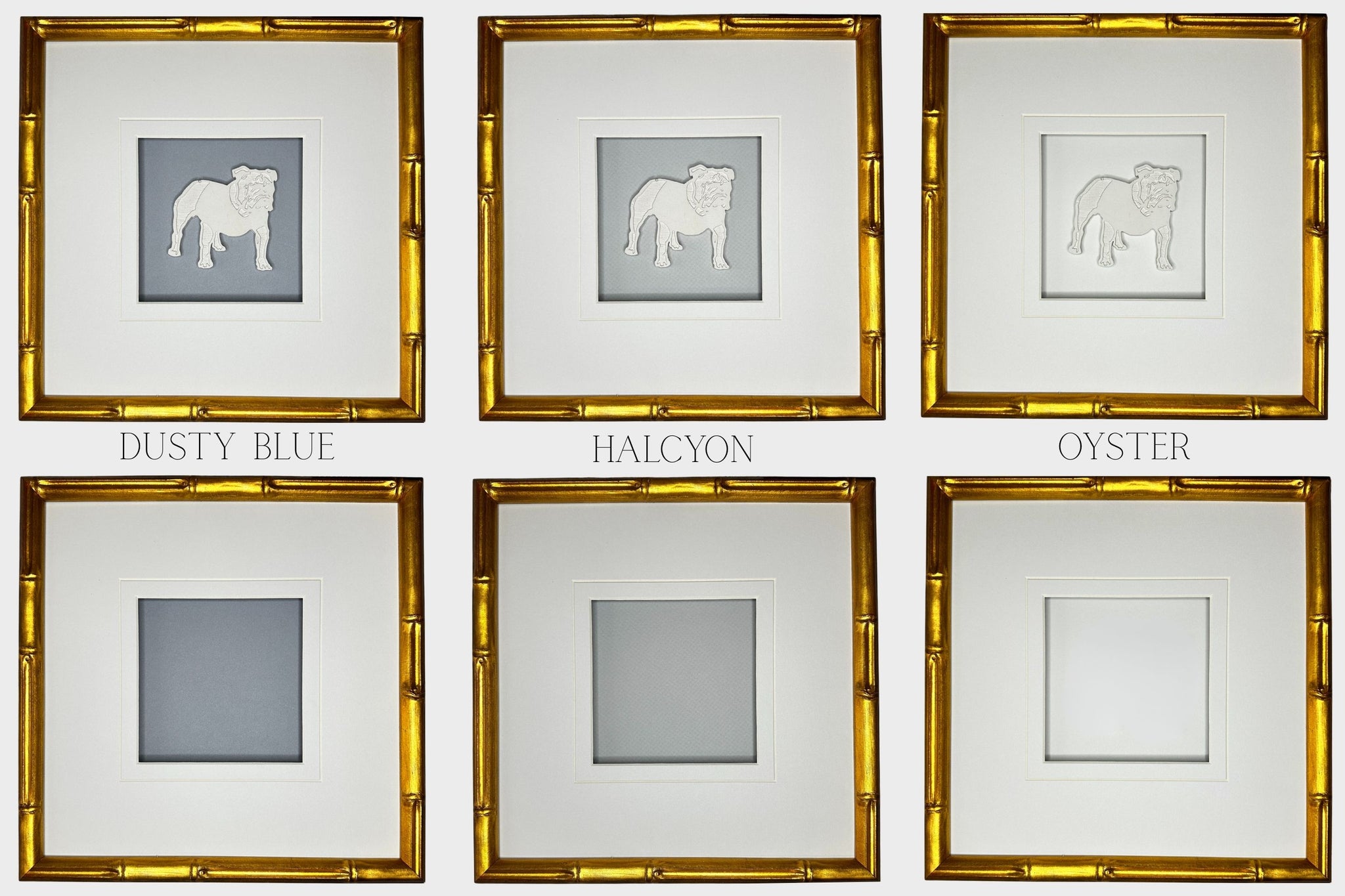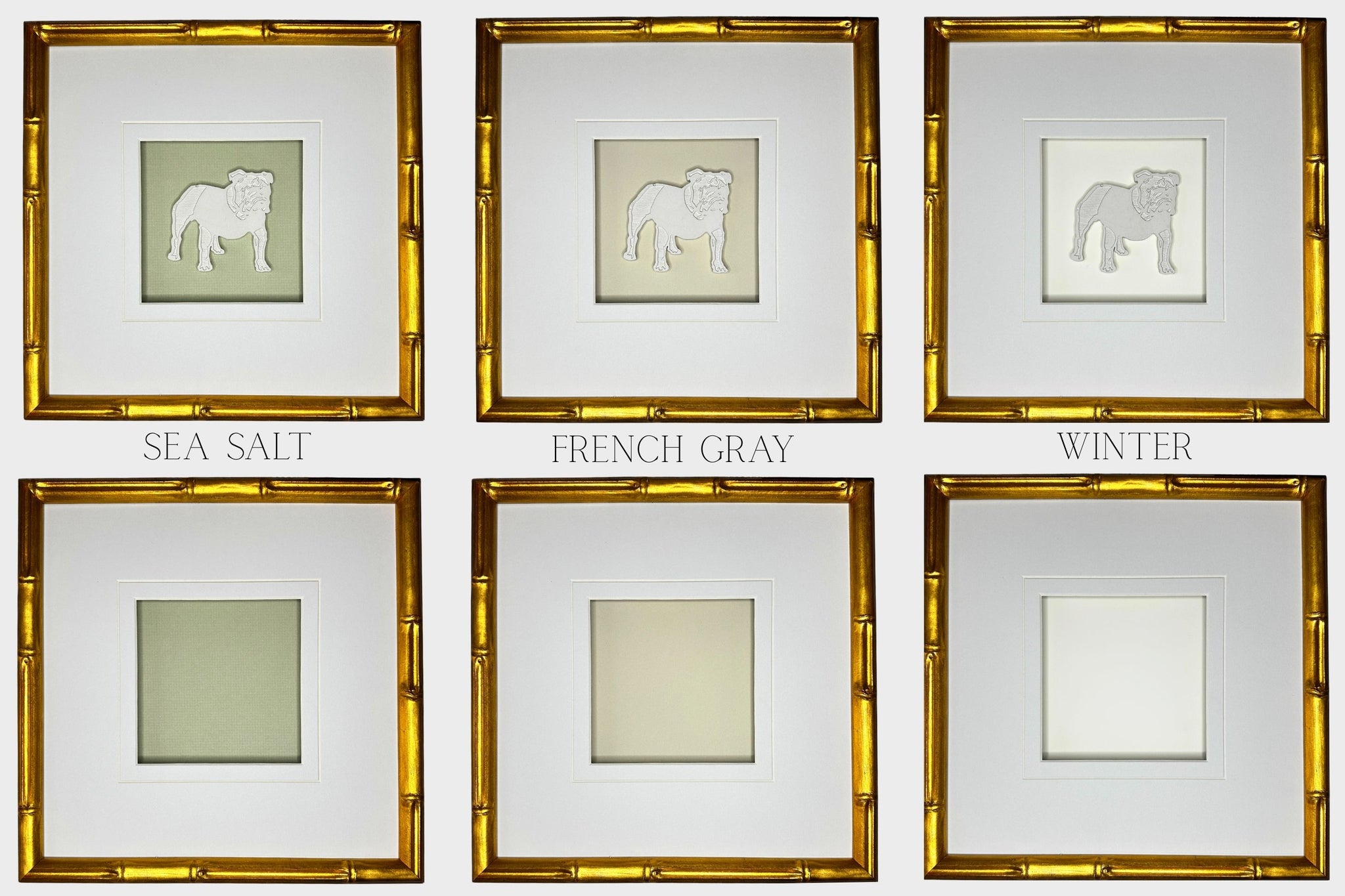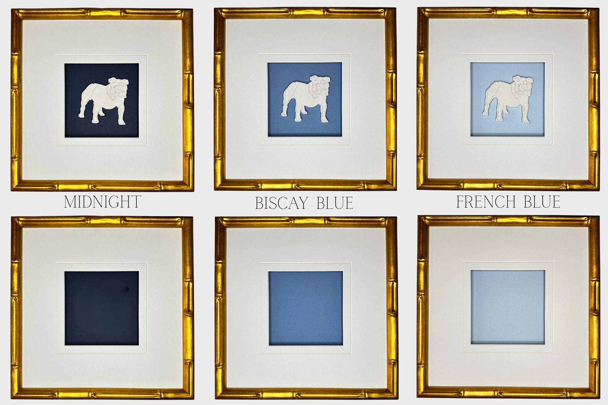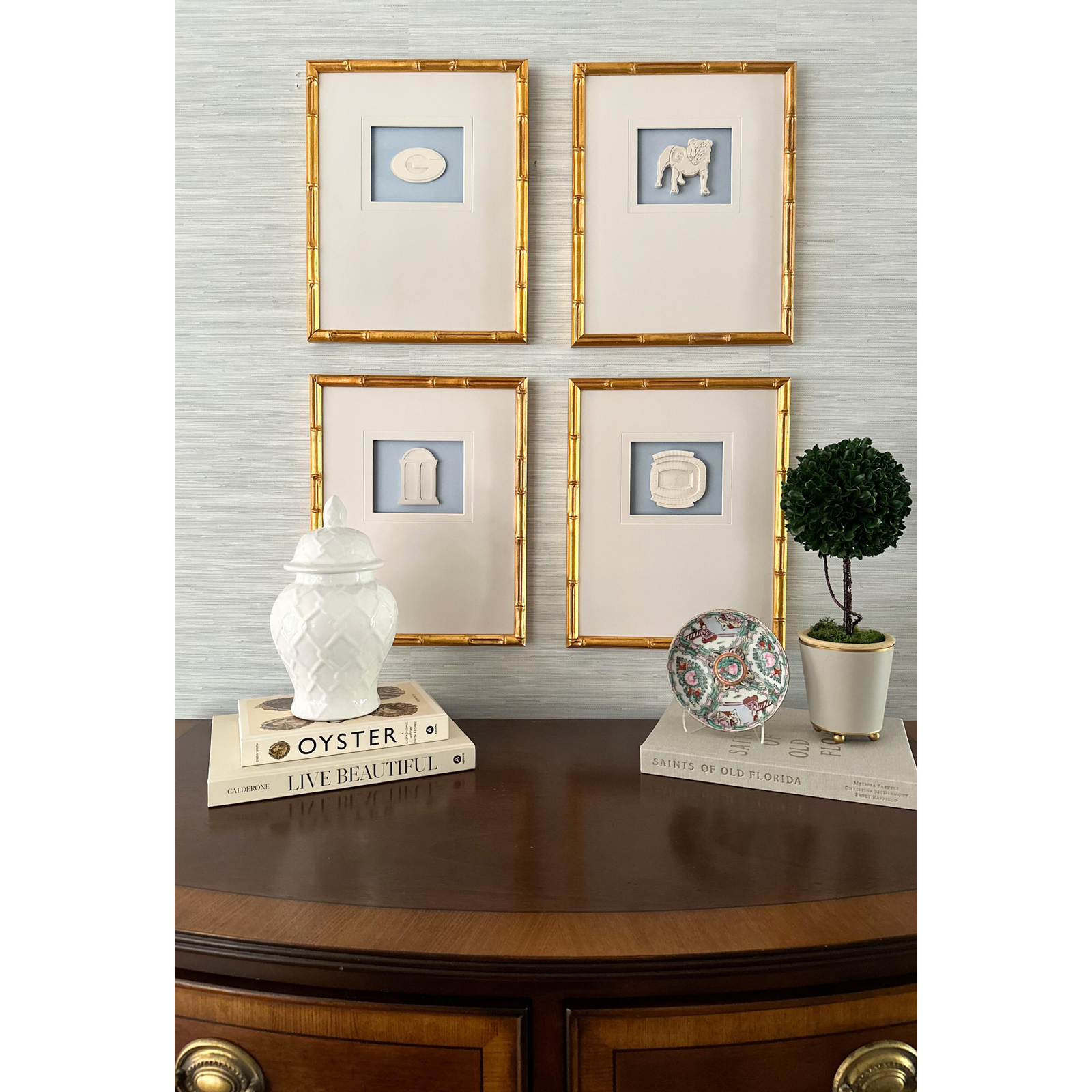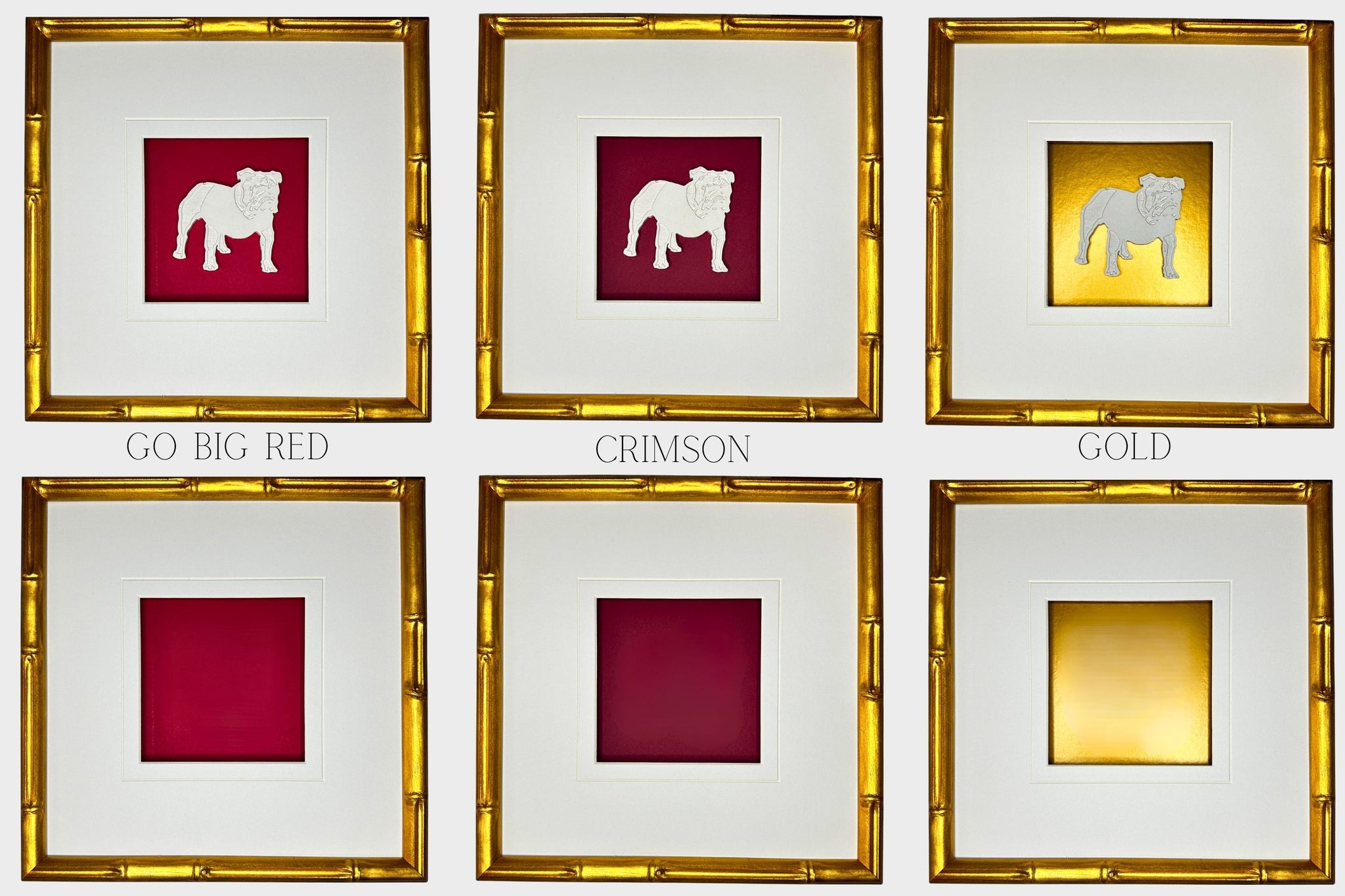Set of four custom-made University of Alabama-inspired intaglios, matted and framed in a glass front gold bamboo frame